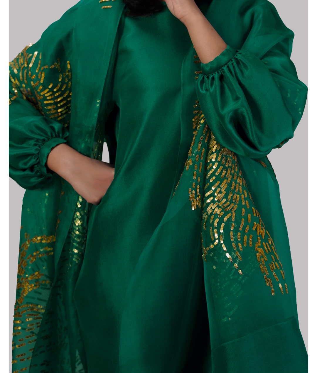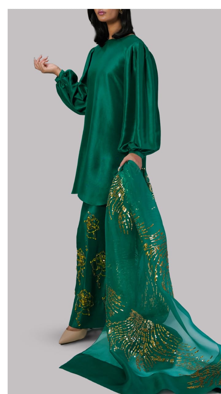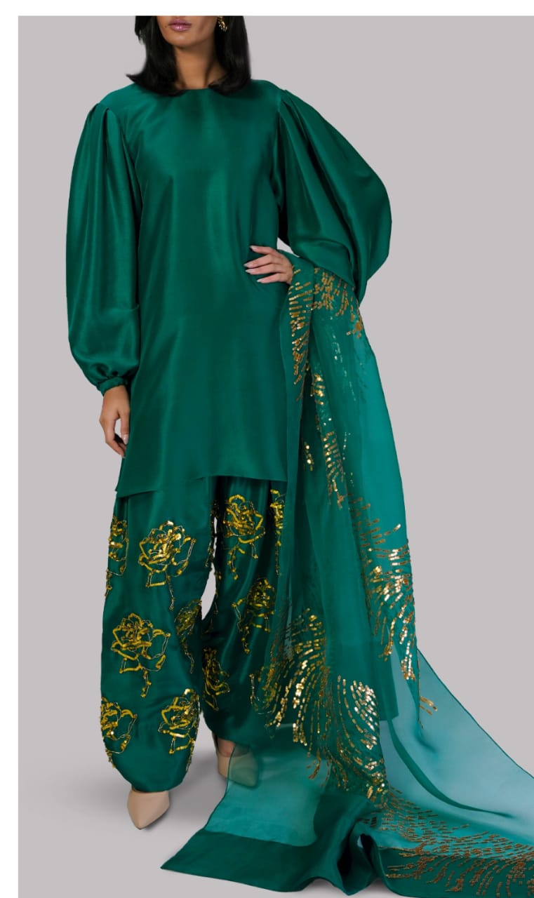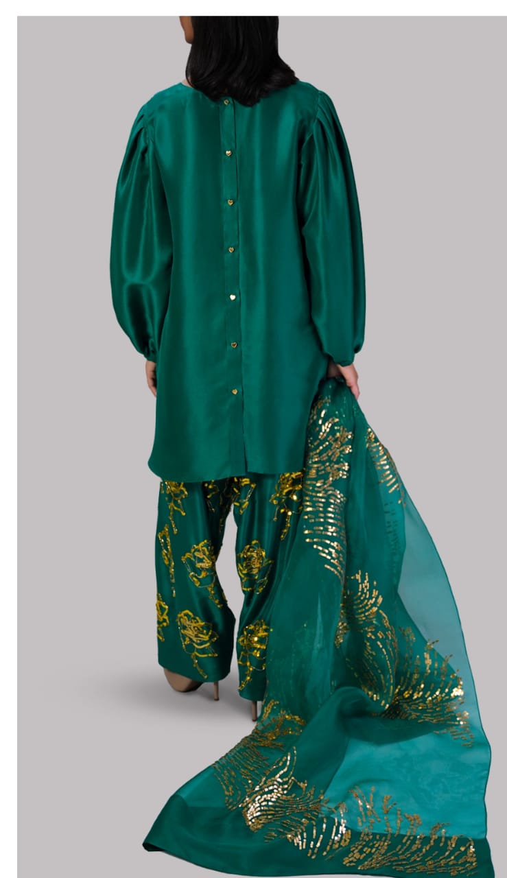 Make a statement in this stunning Galapagos green tunic featuring elegant bishop sleeves and subtle embellishments. The heavily adorned shalwar dazzles with gold sequin rose motifs, while the matching dupatta flows gracefully with winding lines of gold sequins.