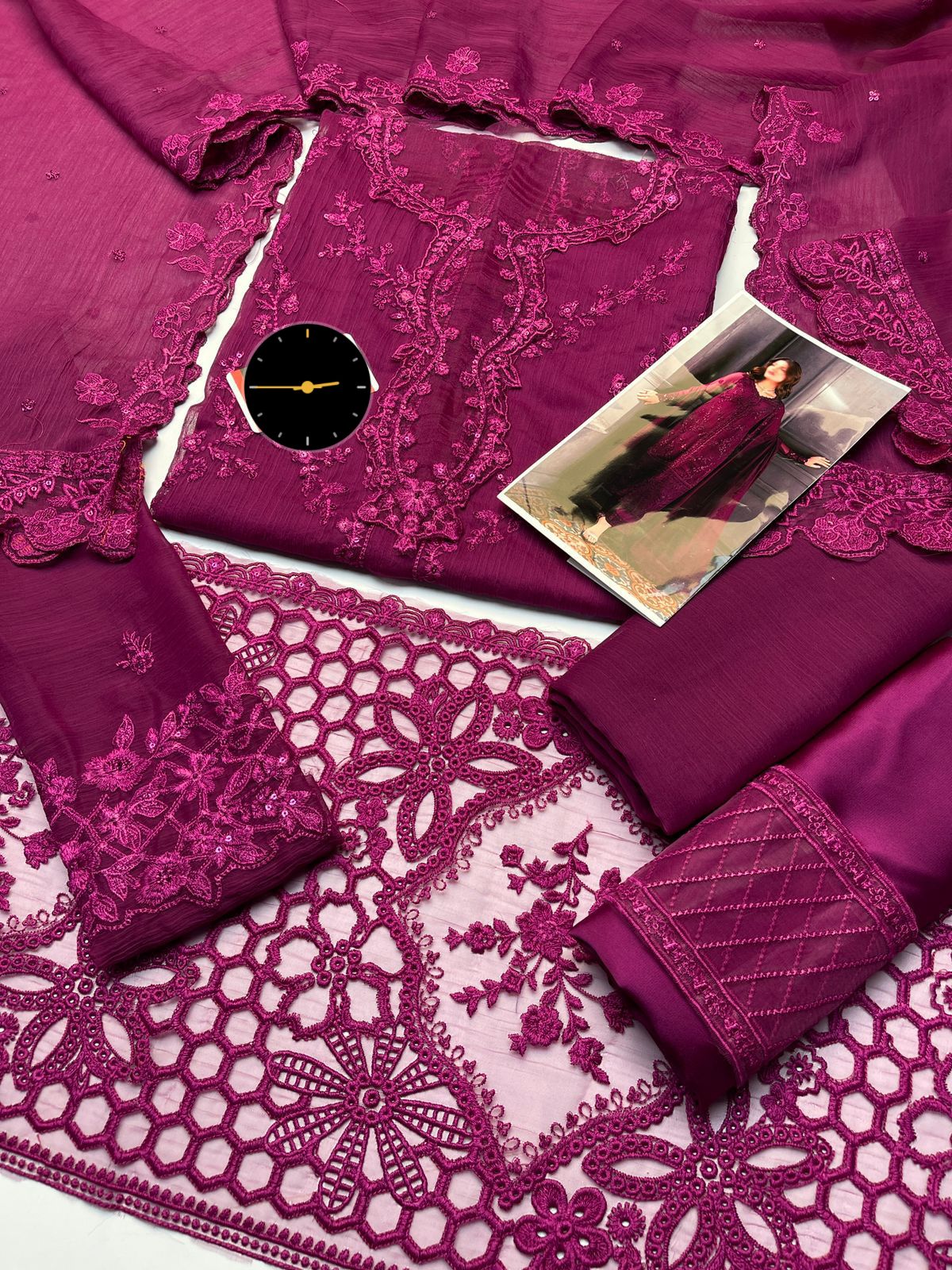 BRAND:AZURE CHIFFON Suit Details: Fully Heavy Embroidery Chiffon Front Heavy Embroidered Neck on Fabric Heavy Embroidery Front Border Chiffon Back Heavy Embroidery Selvees Heavy Embroidery Chiffon Dupatta With 04 Side Embroidery Borders Ready To Wear Dupatta Trouser on SILK Fabric