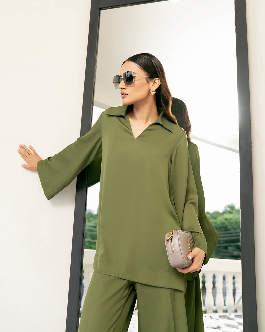 The outfit features a relaxed, flowy silhouette with a front-button shirt and wide-leg trousers that drape beautifully, offering a graceful fall and movement