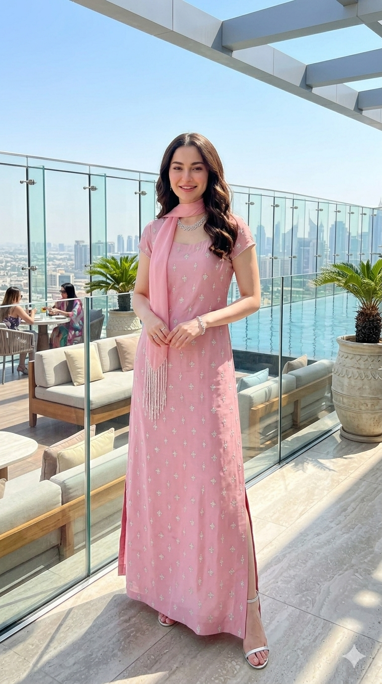 stunning long shirt in a soft, beautiful shade of pink, adorned with delicate sequins scattered all over for a subtle shimmer. The design features graceful cap sleeves, adding a touch of femininity and charm. Paired effortlessly with a luxurious Masuri silk sash, finished with intricate tassel hangings that sway gracefully with every movement. Along with raw silk straight pants — this ensemble is the perfect blend of elegance and modern allure.