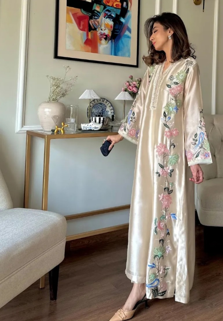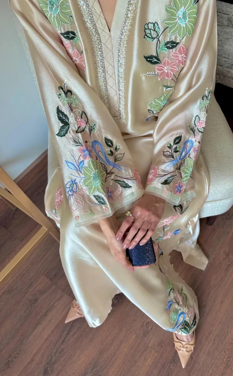The fawn kaftan embodies subtle elegance, adorned with delicate hand embroidery of pearls, crystals, and sequins, along with soft organza appliqué. Finished with neatly tailored sleeves and paired with straight pants, this ensemble offers effortless comfort with a refined, elevated appeal.