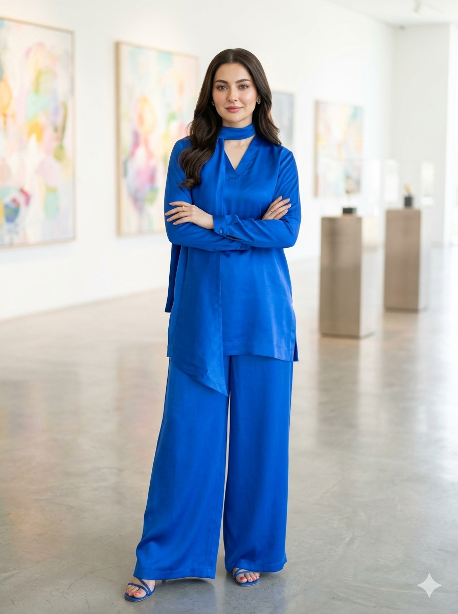 This elegant dark blue outfit is crafted from luxurious charmeuse silk, known for its smooth, lustrous finish and fluid drape. The ensemble features a rich cobalt blue hue that radiates sophistication. The knee length shirt has a relaxed, flowy silhouette with a subtle high neckline and slash detail, paired with wide-leg pants that enhance the outfit’s graceful movement. Perfect for evening soirées or formal gatherings, this look exudes timeless glamour with a modern edge.